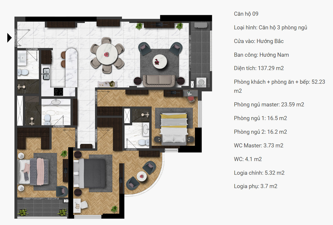 - Diện tích: 68,5 – 121 m2