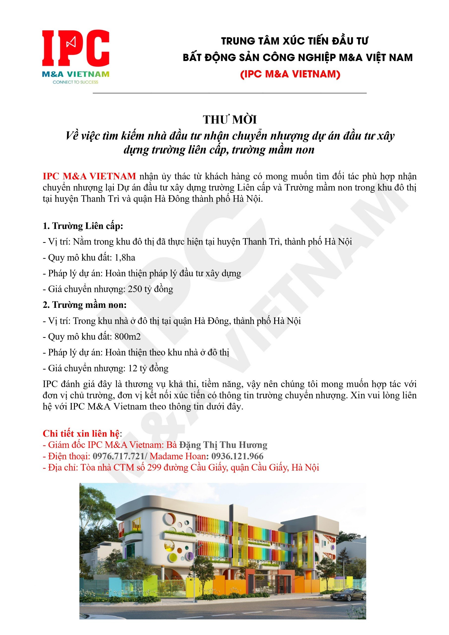Tìm chuyển nhượng Dự án đầu tư xây dựng trường Liên cấp và Trường mầm non trong khu đô thị